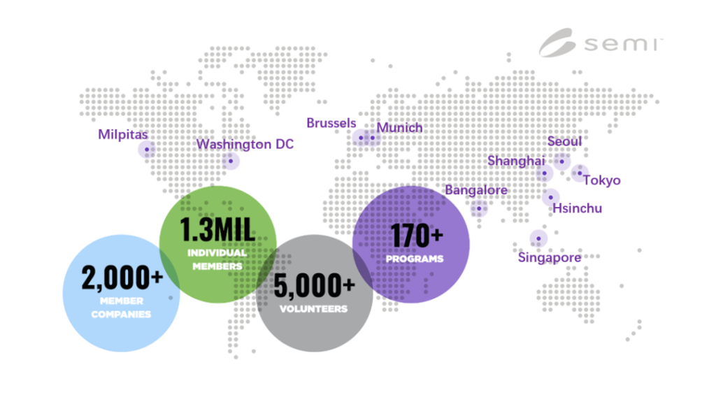 目前,SEMI 已經連接了 2000 多家會員企業和全球 130 萬專業人士來共同推進電子制造行業進步,在全球有十幾個駐點,遍布美國、亞洲(新竹、首爾、上海、新加坡、東京)、印度、歐洲柏林和布魯塞爾。主辦的SEMICON展會有SEMICON China、SEMICON SEA、SEMICON Japan、SEMICON WEST、SEMICON Taiwan、SEMICON Europa、SEMICON Korea 等。??