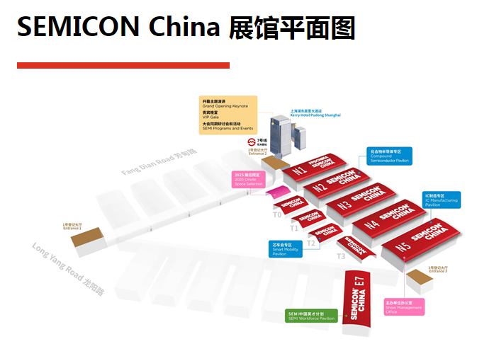 2024 SEMICON China 開幕在即,此次設置了四個主題專區:IC 制造專區、化合物半導體專區、SEMI 中國英才計劃專區、芯車會專區。展館分布在 N1-N5、T01-T7、E3,還有更多盛大活動和同期會議與您共享半導體產業盛宴:開幕主題演講、英才計劃領袖峰會、半導體制造技術產業鏈論壇、創新投資高峰論壇、功率及化合物半導體國際論壇、中國元宇宙顯示大會-硅基顯示等。?
